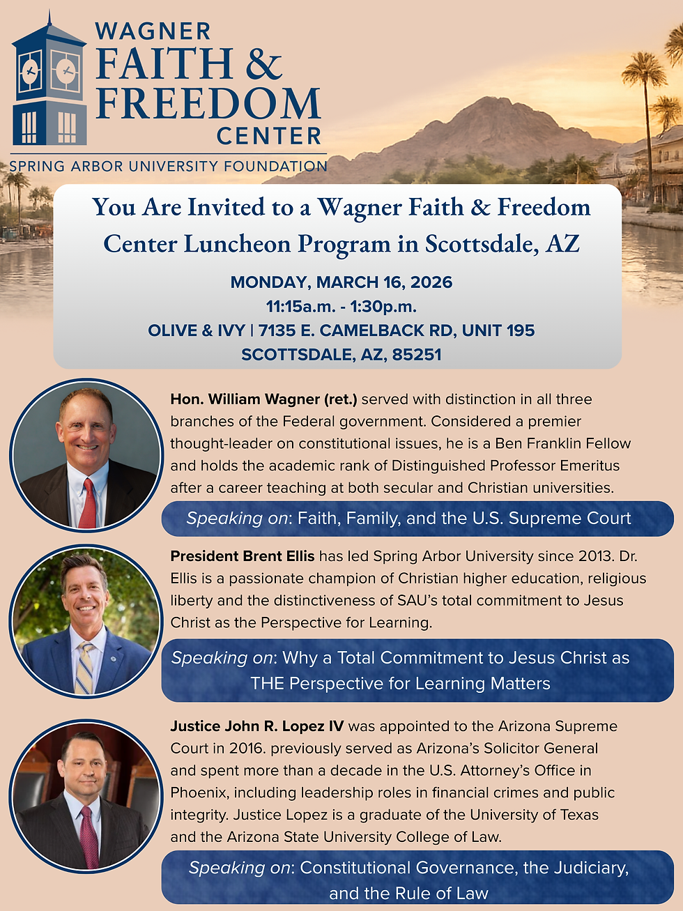 The Wagner Faith & Freedom Center at Spring Arbor University is pleased to invite friends and supporters to a special luncheon program in Scottsdale, Arizona, on Monday, March 16, 2026, at the beautiful Olive & Ivy restaurant.